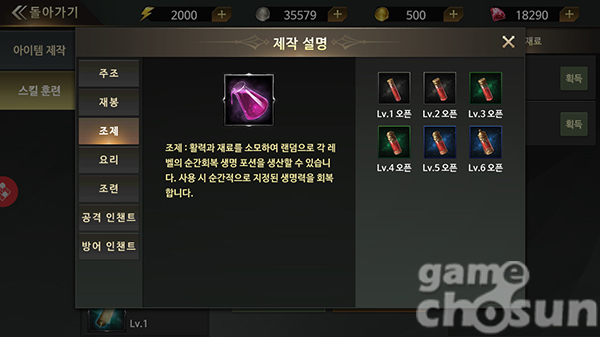 '조제'는 특제 생명 포션을 생산하는 콘텐츠이다. 이 부분은 조금 의문을 가질 법한 것이, 조제에 필요한 제료인 '지혈초'가 상점에서 1000실버나 하는데 잡화점에서 가장 비싼 'Lv70 생명 포션' 역시 1000실버이다.