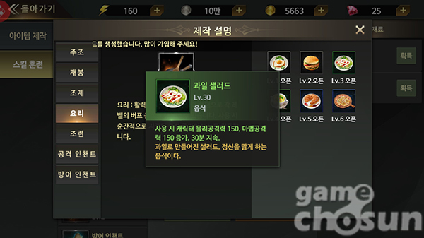 캐릭터의 능력치를 일시적으로 상승시키고 싶다면 '요리' 스킬을 활용해보자. 예를 들어 요리 스킬 레벨 3 때 만들 수 있는 '과일 샐러드'는, 사용 시 30분 동안 캐릭터의 물리공격력과 마법공격력을 150씩 올려주는 도핑 아이템이다. 반지와 같은 장비 한 부위로 상승하는 물리, 마법공격력이 30에서 60 사이임을 생각해보면 음식으로 상승하는 능력치는 상당히 높은 편이다.