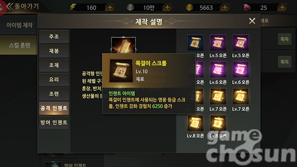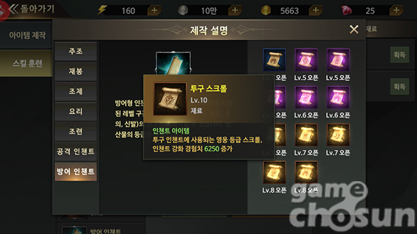 생활 스킬은 레벨이 오를수록 높은 단계의 스크롤을 제작할 수 있기때문에 인첸트 제작에 큰 도움이 된다.