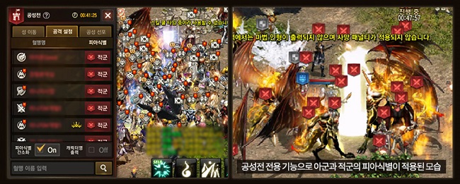 이어서 '공격 설정' 기능이 공개됐다. 기존 필드에서의 전투는 단순히 동맹 혈맹과 적대 혈맹으로 지정된 혈맹의 마크를 보고 임의로 판단해야 했지만, 공성전 중에는 별도의 공격 설정 기능을 이용, 아군 라인과 적대 라인을 한 눈에 구분할 수 있도록 별도의 마커가 생겨남을 알 수 있다.