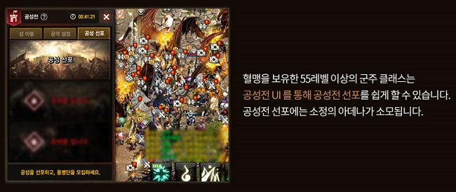 또한, 군주가 행할 수 있는 '공성전 선포' 기능을 선보였다. 혈맹을 보유한 55레벨 이상의 군주 클래스가 해당 창을 통해 공성전을 선포할 수 있는 것으로 알려졌다. 또한, 공성을 선포한 혈맹은 추가로 용병단을 모집하여 세력의 크기를 늘릴 수 있는 것으로 보인다.