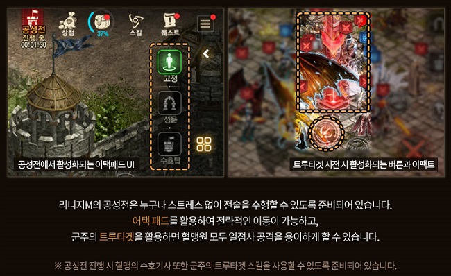 모바일 환경에서 복잡한 공성전 플레이를 돕기 위한 '모바일 최적화 조작 방식'도 일부 공개됐다. 기존에 추가된 바 있는 반격 패드, 선택 대상 설정 기능 외에도 '공성전 전용 어택 패드'를 추가, 주요 오브젝트를 손쉽게 선택할 수 있도록 했다. 또한, 공성전 중에는 군주의 '트루타겟' 스킬을 혈맹 수호기사도 사용할 수 있도록 변경, 이를 통해 혈맹원 전원의 일점사 공격을 가능하도록 꾀했다.