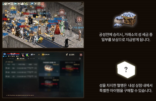 마지막으로 공성전에서 승리한 혈맹은 거래소에서 세율에 따라 누적되고 있는 세금 중 일부를 보상으로 지급받게 되며 첫 공성전 승리 혈맹은 지난 업데이트 때부터 적용, 누적되기 시작한 1% 세율을 얻게 된다. 뿐만 아니라 성을 차지한 혈맹은 성혈만의 권한으로 내성 상점에서 특별한 아이템을 구매할 수 있다는 점을 덧붙였다.