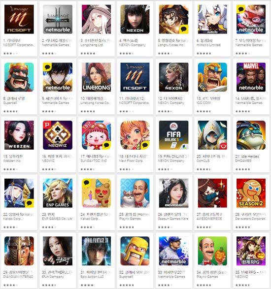 ▲ 2017년 10월 30일 오전 구글플레이 게임 부문 최고 매출 순위 갈무리