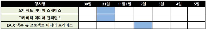 먼저 오는 31일에는 넥슨의 신작 모바일게임 '오버히트' 간담회가 진행되고, 같은 날 그라비티가 신작 '라그나로크M(가칭)'을 비롯한 신작 라인업을 소개하는 자리를 갖는다. 내달 2일에는 EA와 넥슨이 함께 준비 중인 신작 프로젝트가 최초 공개될 예정이다.