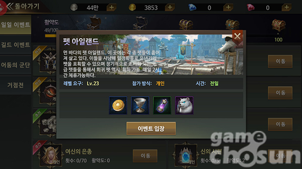 다양한 펫이 서식하는 펫 아일랜드는 '이벤트' 탭을 통해 들어갈 수 있으며 2시간 동안 머물 수 있다. 이곳에는 노말에서 전설 등급에 이르는 다양한 종류의 펫이 서식한다.