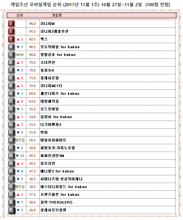 이밖에 지난주 첫 차트 진입한 신작 ‘대항해의길’은 이번주 8계단을 올린 11위다. 7위 ‘붕괴3’는 다소 하락세를 보였고 6위 ‘소녀전선’이 1계단 순위를 앞질렀다. 또 ‘데스티니차일드’가 22위로 순위권 재진입했다.