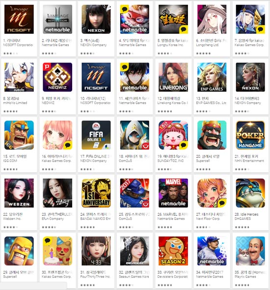 ▲ 2017년 11월 6일 오전 구글플레이 게임 부문 최고 매출 순위 갈무리