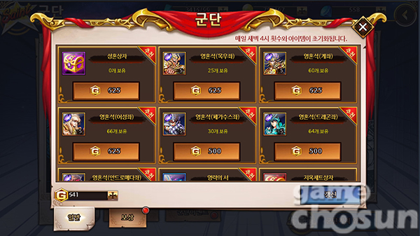 군단 코인으로 성혼상자, 영혼석은 물론 세인트 성장에 필요한 다양한 소모품을 구매할 수 있는 상점. 경기장 상점과 마찬가지로 매일 04시 초기화되는 일반 판매와 보상 판매로 이루어진다.