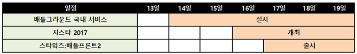 11월 3주 게임업계에는 전 세계적으로 큰 인기를 끌고 있는 '배틀그라운드'의 국내서비스가 진행된다. 또 국제게임전시회 '지스타2017'이 오는 16일부터 19일까지 부산 벡스코에서 열릴 예정이다.
