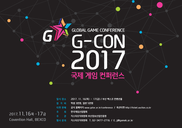 부산 벡스코 컨벤션홀에서 열리는 'G-Con 2017'은 국내외 게임산업의 주요 인사들이 발표자로 참여하며 IP, VR/AR, 콘솔, 온라인, 모바일 등 전체 13개 세션으로 구성됐다.