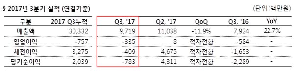 ▲ 한빛소프트 2017년 3분기 실적 (출처 : 한빛소프트)