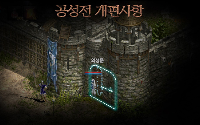 이번 업데이트 내용 중 공성전 추가 개선 사항도 있다. 외성문 양 옆의 쪽문 크기가 1셀에서 2셀로 넓어지면서 외성 침투가 쉬워진다. 또 처치 시 내성으로 텔레포드할 수 있는 근위병의 개체수도 증가해 공성측의 내성 침투가 한층 유리해질 전망이다. 지난주에 이어서 이번주 역시 수성측보단 공성측에 유리한 내용의 업데이트가 예고되었다.