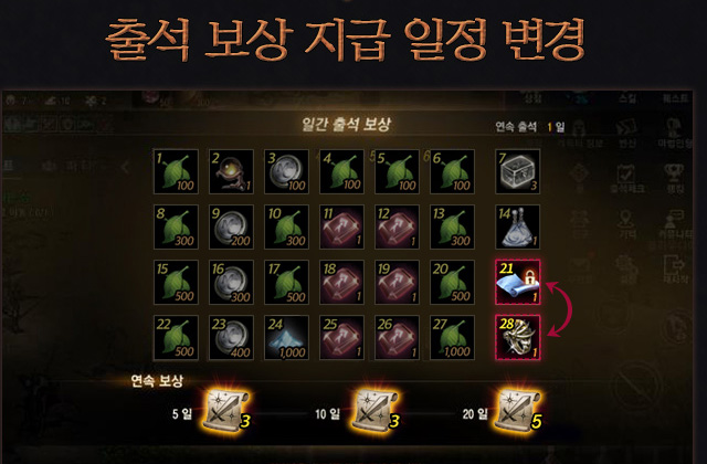 한편, 출석 보상 지급 일정을 변경하여 본래 출석 28일 차에 지급하는 봉인왼 희귀 장신구 제작 비법서를 출석 21일 차에 지급하는 스냅퍼의 용사 반지와 지급 일정을 변경한다. 즉, 출석 21일 차에 봉인왼 희귀 장신구 제작 비법서, 출석 28일 차에 스냅퍼의 용사 반지를 보상으로 지급받는다.