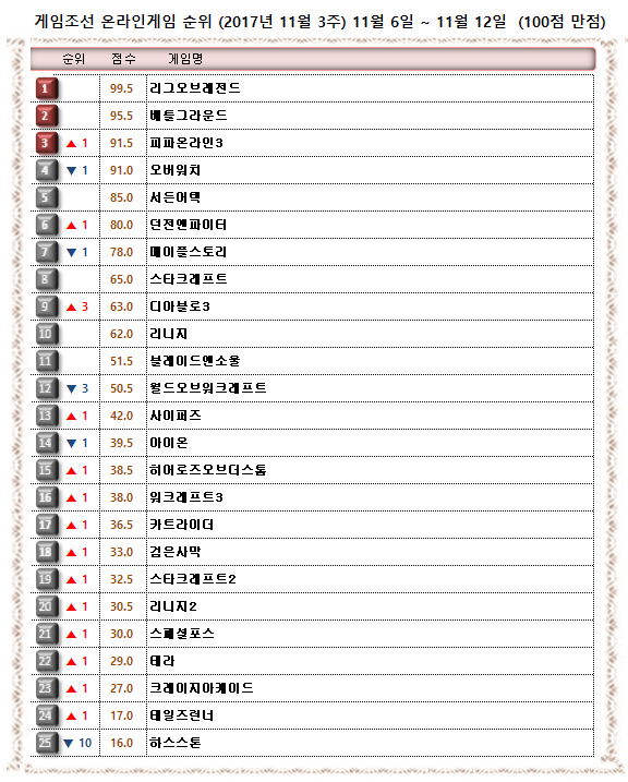 11월 셋째 주 온라인게임순위를 살펴보면 1계단씩 소폭한 상승한 게임이 차트 전반적으로 나타났다.
