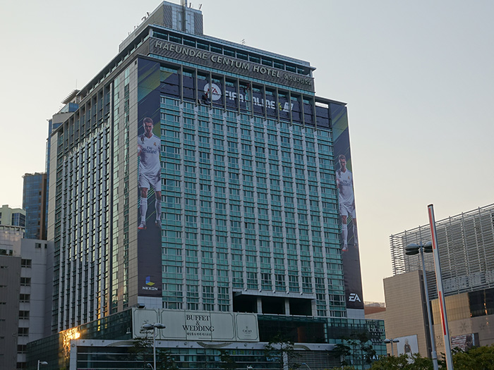 ▲ 센텀 호텔에는 '피파온라인4' 배너가 붙어있다 (출처: 게임조선 촬영)