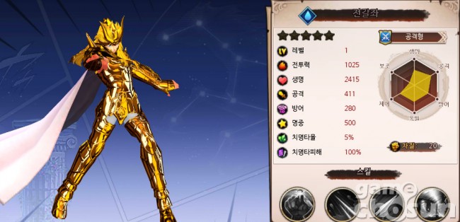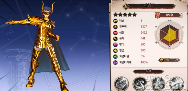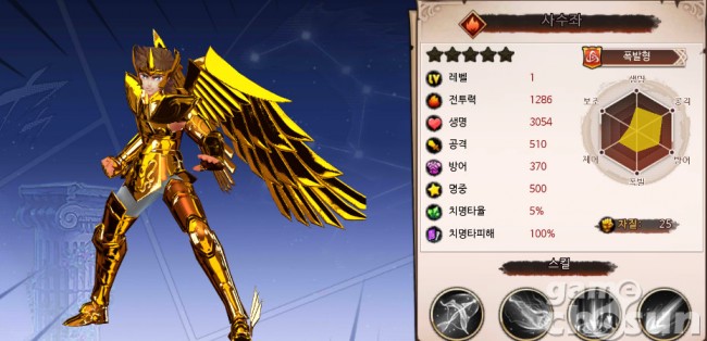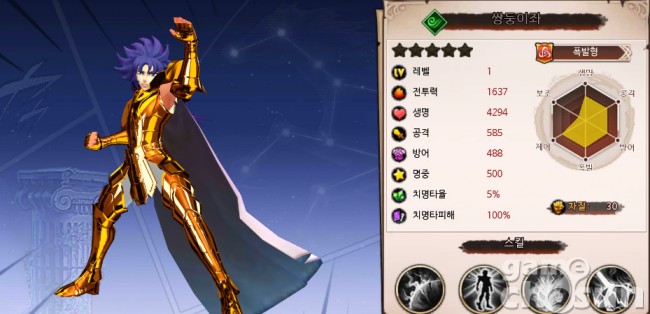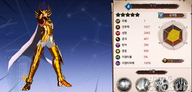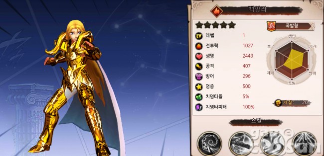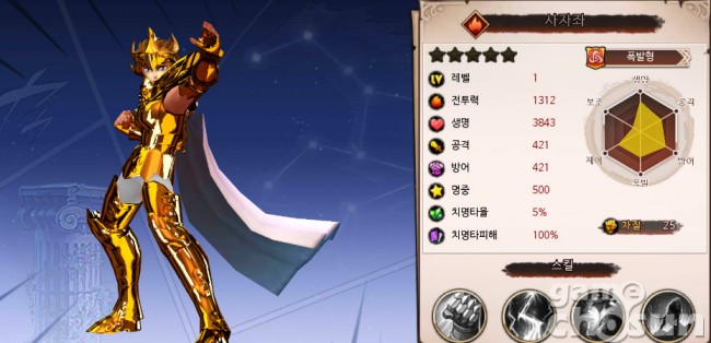 불속성. 폭발형. AI 전의 익스퍼트. 현 버전 골드 세인트 중 조각을 얻기 가장 쉽다. 같은 불속성에 자질 25의 사자좌, 사수좌 승급 단계 갖춰질 때까지 주력으로 키울 만하다.