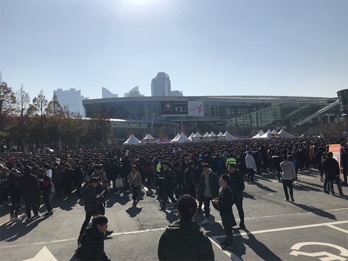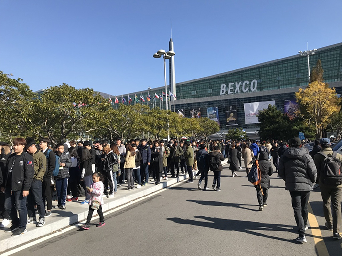18일 오전부터 벡스코 일대는 구름 관중으로 일찌감치 만원을 이뤘다. 매표소가 있는 주차장은 입장권 구입을 위해 끝이 보이지 않는 대기열이 생겼고, 중앙 도로까지 행렬이 이어졌다.