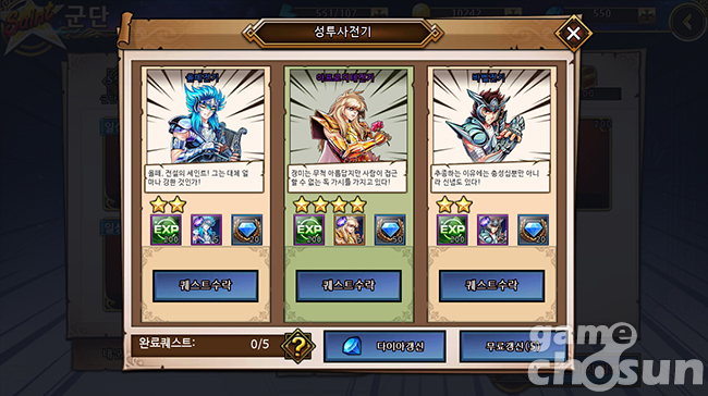 성투사 전기는 하루 5번, 3명의 세인트 중 마음에 드는 세인트의 임무를 골라 진행하는 스토리텔링형 콘텐츠다.