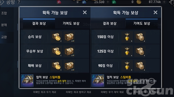 팀의 승패에 따른 보상으로는 전쟁 영웅의 아데나 상자, 전쟁 영웅의 전리품 상자가 있다. 최소 S등급 이상의 장비/집혼석 연마제나 승급석, 강화주문서가 나오기 때문에 대기시간을 포함하여 약 1시간이라는 적은 투자만으로도 후한 보상을 얻은 셈이다.