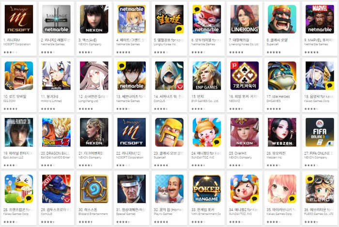 ▲ 2017년 11월 27일 오전 구글플레이 게임 부문 최고 매출 순위 갈무리