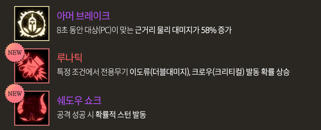 다크엘프의 간판 스킬인 아머 브레이크 외 신규 스킬 2종이 4단계 흑정령 마법으로 등장했다. 아머 브레이크는 대인전 전용 스킬로 PC(플레이어)에게만 시전할 수 있다. 8초 동안 대상이 피격하는 근거리 물리 대미지를 58% 증가시킨다. 쉐도우 쇼크는 공격 성공 시 확률적으로 스턴이 발동하는 패시브 스킬이고 루나틱은 특정 조건(HP 감소)에서 전용 무기 이도류의 더블대미지, 크로우의 크리티컬 발동 확률이 상승한다. 아머 브레이크와 쉐도우 쇼크는 전설 등급, 루나틱은 영웅 등급 스킬로 분류되었다.