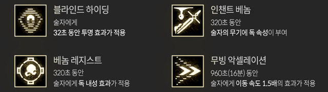 상대를 중독시키는 인챈트 베놈과 다크엘프의 독 내성을 높여주는 베놈 레지스트, 다크엘프의 이동속도를 1.5배 향상시키는 무빙 악셀레이션 그리고 은신 스킬인 블라인드 하이딩이 1단계 흑정령 마법으로 공개됐다. 기습에 효과적인 은신 스킬의 등장으로 필드 전투에서의 변화가 예상된다.