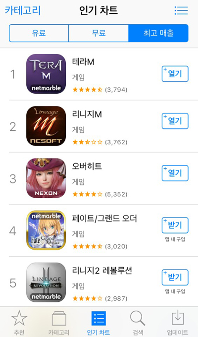 애플 앱스토어 매출 1위는 약 5개월간 유지돼 쉽사리 순위 변동이 예측되지 않는 상황이었지만 '테라M'이 출시와 함께 판도를 바꾼 것.