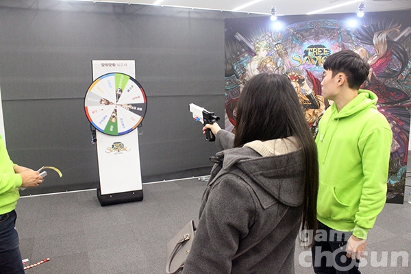 |▲ 다트건을 이용해 뽑기를 진행하는 트리오브세이비어의 관객 참여 행사