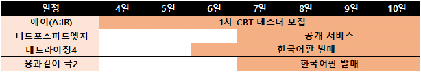 '배틀그라운드'로 인기몰이 중인 블루홀은 차기작 '에어(A:IR)' 비공개테스트를 앞두고 테스트 참가자 모집이 한창이며, 온라인 레이싱게임 '니드포스피드엣지'도 공개 서비스에 돌입한다.