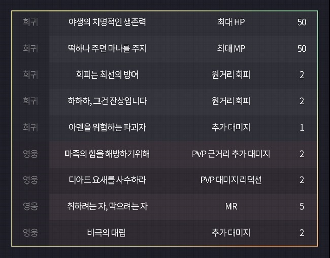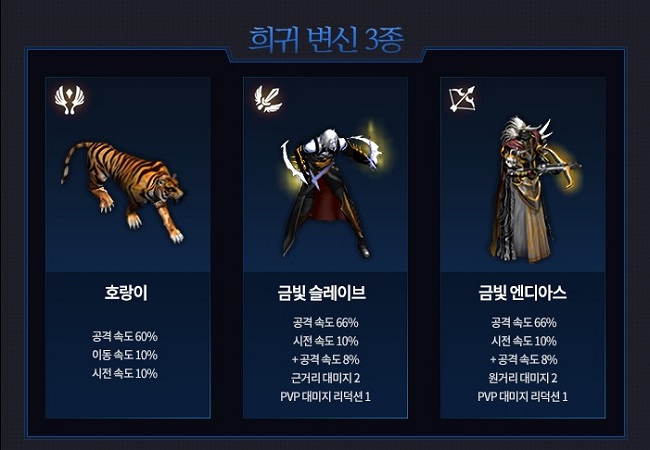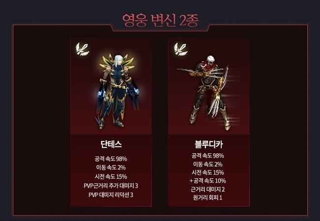 특히 영웅 등급 변신인 단테스는 PVP 대미지 리덕션 +3 & 근거리 추가 대미지 +3이 부여돼 기존 영웅 등급보다 훨씬 좋은 PVP 성능을 지녔으며 블루디카의 경우는 기존 영웅 등급 변신보다 무려 10%나 공격 속도가 향상됐고 근거리 대미지 +2에 원거리 회피 +1로 우월한 능력치를 보이고 있다.