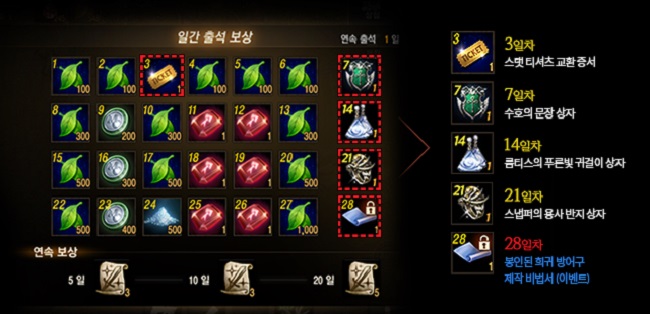 다음으로 13일(수)부터 일간 출석 보상이 갱신돼 3일차에 '스탯티셔츠 교환 증서', 7일차에 '수호의 문장 상자', 14일차에는 '룸티스의 푸른빛 귀걸이 상자', 21일차에 '스냅퍼의 용사 반지 상자'가 주어진다. 그리고 마지막 28일차에는 '봉인된 희귀 방어구 제작 비법서(이벤트)'가 주어질 예정이다.