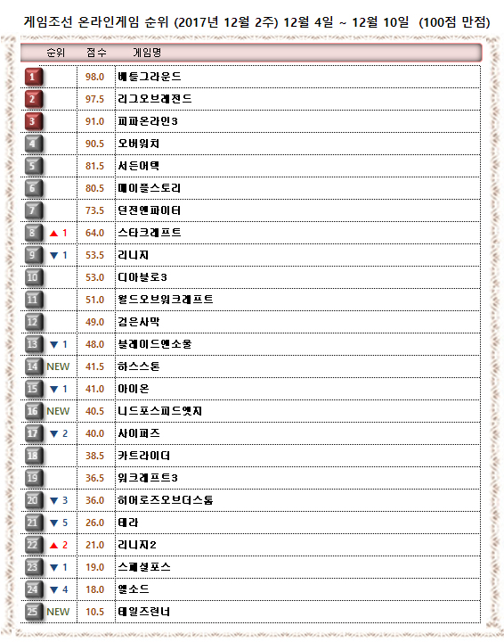이번주 전반적인 순위는 겨울철 신규 게임 출시와 대규모 업데이트로 다소 변동폭이 컸다. ‘하스스톤’은 신규 확장팩 출시 효과를 누리며 14위에, ‘테일즈런너’는 겨울 업데이트 ‘꽃보다 기사’를 실시하며 25위에 진입했다.