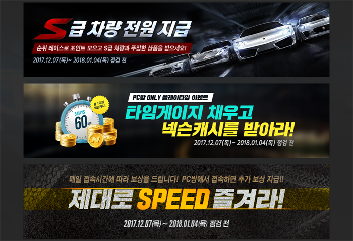 이벤트 기간동안 주말 핫타임은 놓치면 안되는 이벤트다. 매주 11~12시, 16시~17에 A~C급 차량팩이 제공되며 PC방에서 접속 시 최대 4대까지 차량 획득이 가능하다.