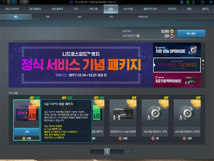 A급 TOP 10 종합 패키지는 상위 10개 차량팩과 A~C급 차량팩 2개, 75만~750만SP, 파츠 장착 해제권 50개, A급 파츠 레벨3 패키지로 구성됐으며 A급 TOP 20 종합 패키지, A급 TOP 40 종합 패키지가 마련돼 있다. 각 패키지는 4900원, 3900원, 2900원이다.