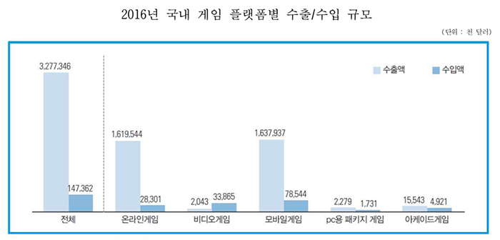 ▲ 2016년 국내 게임 플랫폼별 수출/수입 규모 (출처=2017 대한민국 게임백서 요약본)