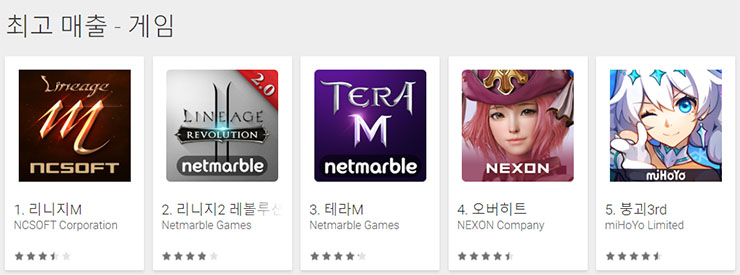 △ 2017년 12월 17일 오전 구글플레이 게임부문 최고매출 TOP5