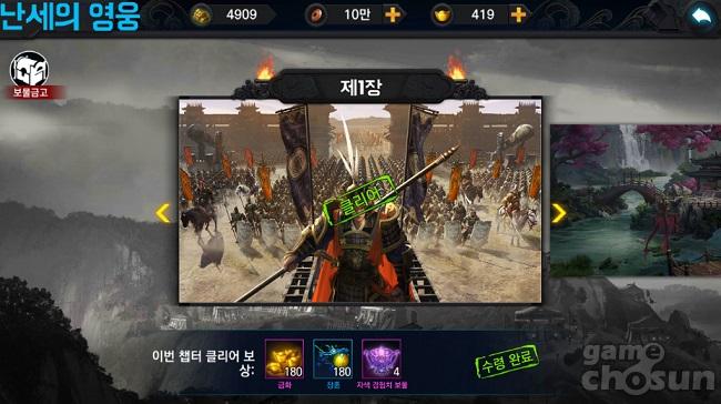 제2장을 모두 클리어하면 난세의 영웅 이제까지와 달리 선봉 - 중진 - 후위로 이루어져 스코어 대결을 하는 첫번째 영물 스테이지에 도전할 수 있는데 이곳의 난이도가 상당한 편으로 세 진영을 모두 고르게 키우지 않았다면 고전할 가능성이 높다. 다른 콘텐츠와 달리 상당한 후반 콘텐츠에 속한다