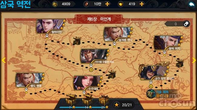 스테이지 클리어 보상으로 엽전과 금화, 기술 포인트를 얻을 수 있으며 각 장 별로 정해진 별 개수 달성 시, 각 장의 특정 시나리오 클리어 시 돌파령을 포함한 든든한 추가 보상을 얻을 수 있다. 또한, 각 장의 마지막 시나리오를 클리어하게 되면 상위 기술이 해금된다.