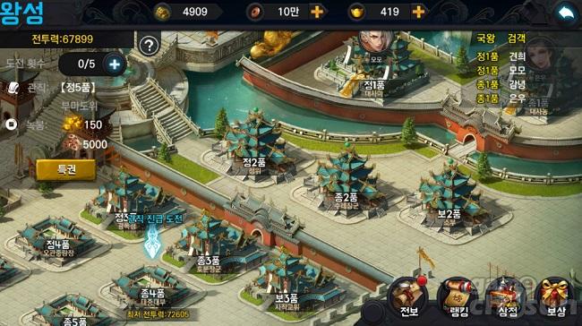 왕성 쟁탈은 국가 내 관직을 '찬탈'하는 형태의 콘텐츠다. 같은 국가 내의 유저와 겨루어 승리 시 해당 관직으로 승급하게 된다. 9품부터 시작하여 정1품, 그리고 국왕까지 진급할 수 있다. 하루 도전 횟수가 정해져 있으며, 실패 시에도 횟수가 차감되므로 승패를 확실하게 예견할 수 있어야 한다.