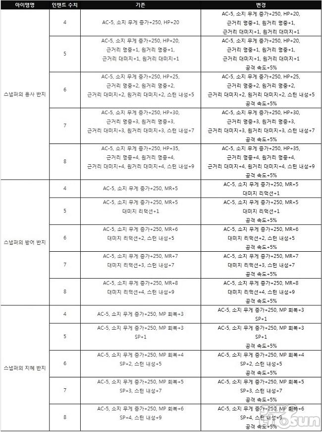 +4 강화 이상 스냅퍼의 반지 옵션도 변경됐다. +4 강화 스냅퍼의 용사 반지는 기존 옵션에 '근거리 명중 +1', '원거리 명중 +1', '근거리 대미지+1', '원거리 대미지+1'이 추가됐어 +5 강화 이상부터는 기존 기존 옵션에 '공격 속도+5%'가 붙으면서 더욱 뛰어난 성능을 자랑하게 됐다.