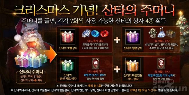 이번 업데이트는 '크리스마스' 이벤트와 '산타의 주머니' 패키지 상품 판매, '+4 강화 이상 스냅퍼의 반지' 옵션 리뉴얼 등을 주요 골자로 한다.
