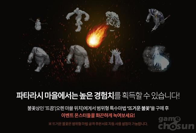 또한 '불꽃상인 뜨끔' NPC로부터는 '뜨거운 불꽃'을 구입 가능하며 해당 아이템은 시련 던전의 '미티어 스트라이크'와 비슷한 효과를 가진 마법 스크롤이다. 단, 뜨거운 불꽃은 파타라시 마을 내에서만 사용할 수 있다. 이벤트 맵에서는 몬스터 처치 시 일정 확률로 '크리스마스 쿠키'를 얻을 수 있는데 해당 아이템은 '환전소 데나' NPC에게서 '명예 코인', '마법인형 제작 코인', '변신 제작 코인' 등으로 교환된다.