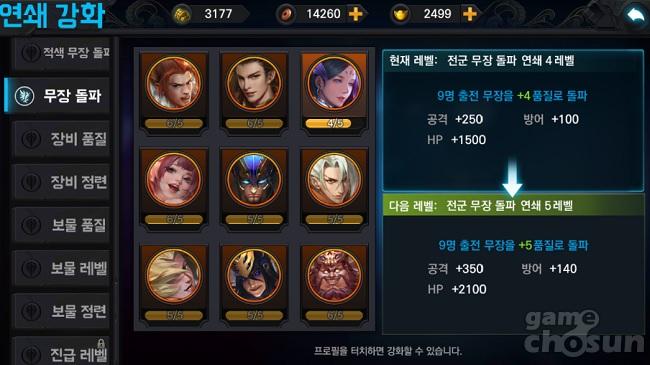 | 무장 돌파 | 9명 출전 무장 돌파 단계에 따라 증가 | 공격, 방어, HP |