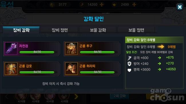 | 장비 정련 | 9명 출전 무장 모든 장비 정련 급수에 따라 증가 | 공격, 방어, HP |