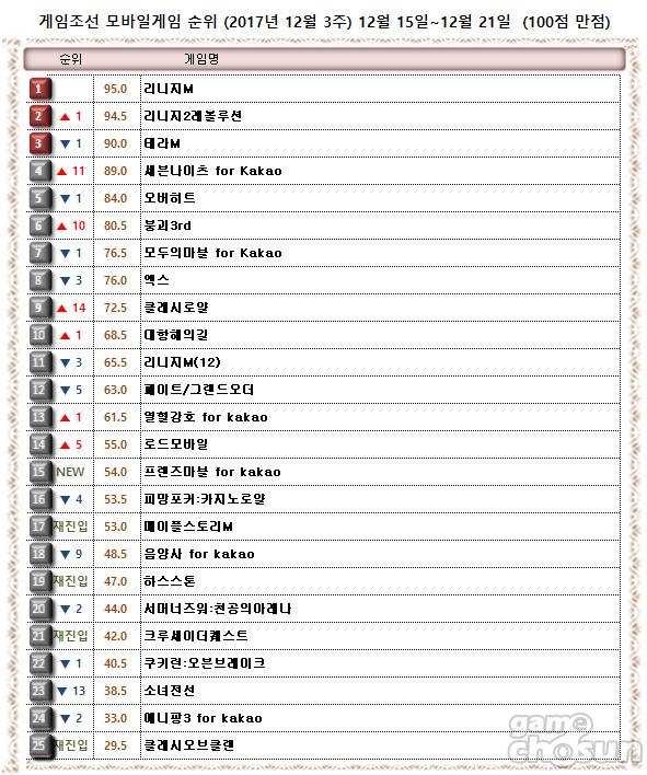 12월 3주 모바일게임순위에서는 ‘세븐나이츠’가 5위권으로 도약한 가운데 ‘메이플스토리M’ ‘크루세이더퀘스트’가 순위권에 재진입하며 부활 신호탄을 쐈다.