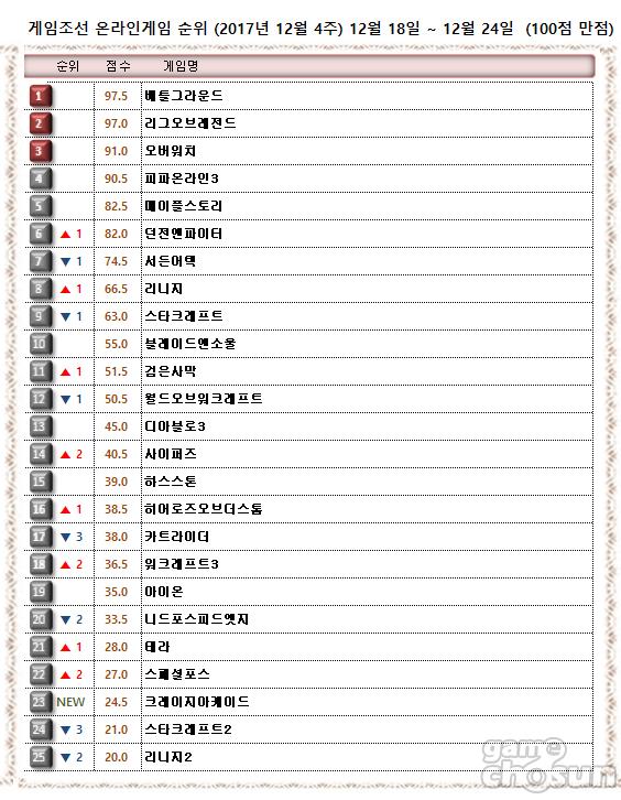 하위권에서는 연말연시 이벤트를 연 ‘테라’가 1계단 오름세를 보였으며 ‘크레이지아케이드’가 순위권 재도약했다.