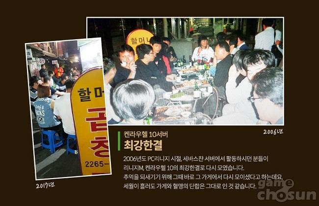 첫 번째로 소개한 혈맹은 켄라우헬 10서버의 '최강한결'. 이들은 2006년 PC 리니지 시절, 세바스챤 서버에서 홛동하다가 리니지M을 통해 다시 뭉쳤다. 추억을 되새기기 위해 이들은 2006년 당시 혈맹 모임에 방문한 바 있는 식당에서 다시금 모임을 진행했다고 한다.