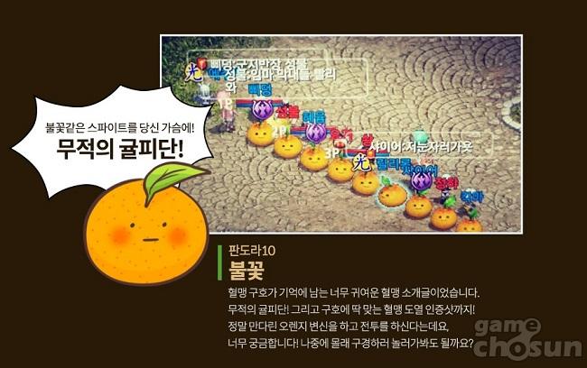 다음은 판도라 10서버의 '불꽃' 혈맹이다. 불꽃 혈맹은 독특한 혈맹 소개글로 눈길을 끌었는데, 스스로를 '무적의 귤피단'이라고 밝히며 게임 내의 캐릭터 변신 중 하나인 '만다린 오렌지'로 분해 귀여운 도열 인증샷을 선보였다. 일설에 의하면 게임 내 전투 시, 만다린 오렌지 변신한다고 하지만 확인된 바는 없다.