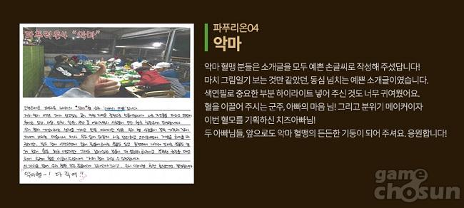 사이하 05서버의 '무장' 혈맹도 소개됐다. 무장 혈맹은 그들만의 마스코트인 반려견 '뭉클'과 혈맹원 '꽃보다득춘'의 아재심 가득한 애교로 이목을 끌었다. 특히 모임에서 단체 티셔츠를 맞춰 입은 사진으로 그들의 단결력을 보여줬다. 파푸리온04 서버의 '악마' 혈맹은 정성스런 손글씨로 혈맹 소개를 했다. 사진과 함께 작성된 글은 마치 한 편의 그림일기를 보는 듯했다.